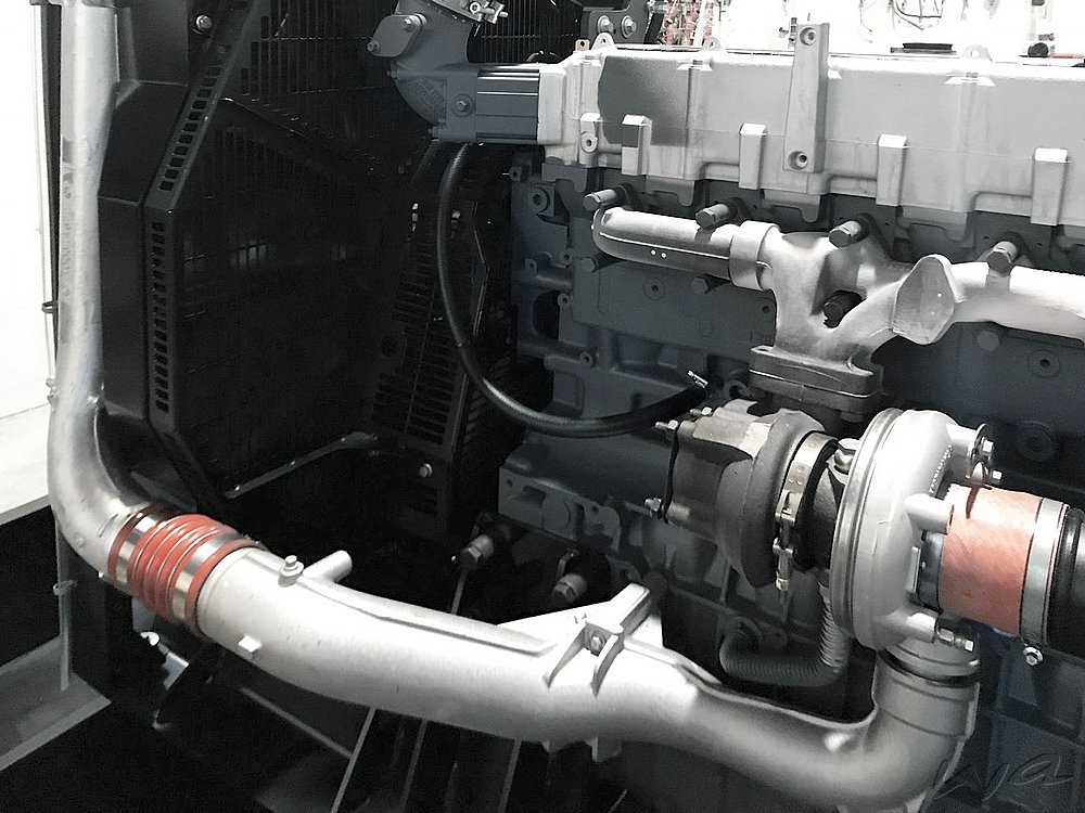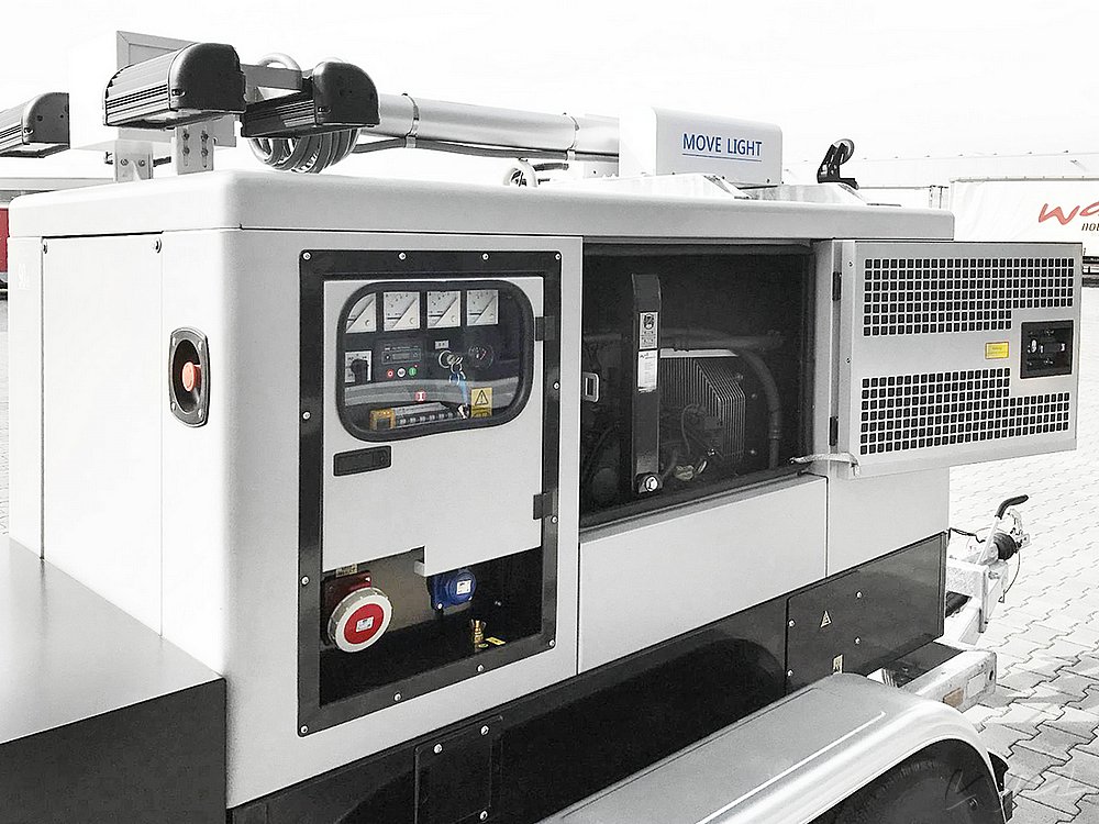 Notstromaggregat: Das komplette Notstromaggregat als Netzersatzanlage wird auf einem Grundrahmen aus verschweißten Kantprofilen aus Stahl in einer robusten Konstruktion montiert. Am Grundrahmen sind speziell konstruierte Vorrichtungen zum Heben mit einem Kran angebracht. Der Dieselmotor und der Generator sind direkt über einen SAE-Flansch miteinander verbunden, so dass selbst nach einem längeren Betrieb keine Möglichkeit eines Ausrichtungsfehlers besteht. Der Tagestank ist in dem Grundrahmen integriert. Die Starterbatterie 12 Volt ist auf dem Grundrahmen montiert und betriebsfertig verkabelt.